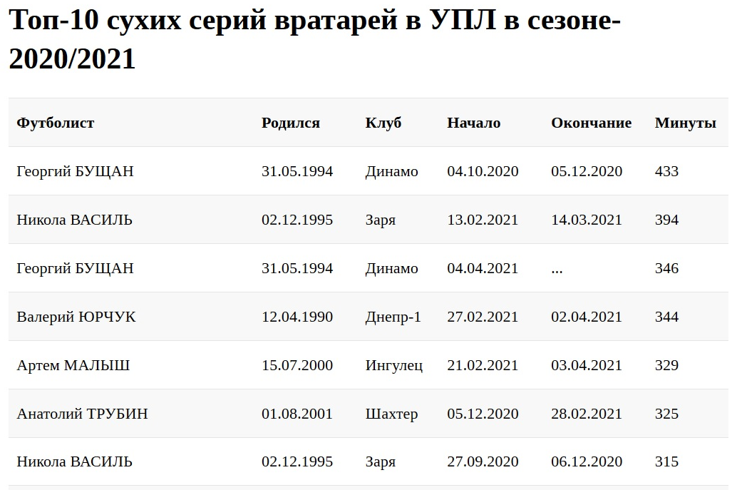 А сразу после гола Ситало у Бущана началась новая сухая серия, которая насчитывает уже 346 минут. На данный момент это — третий результат в УПЛ в сезоне-2020/2021. Но достаточно Бущану сыграть на ноль еще один поединок, как он улучшит рекорд сезона. Который принадлежит… Бущану и был установлен в осенней части чемпионата Украины.