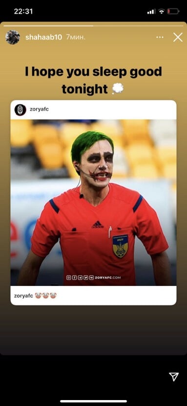 Нападающий «Зари» Шахаб Захеди опубликовал сторис с главным арбитром матча УПЛ против «Олимпика» (1:2) Николаем Балакиным.