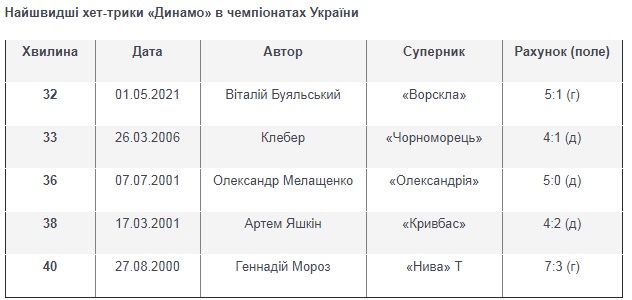 - 1-й хет-трик Віталія Буяльського в УПЛ (в 165-й грі) був оформлений на 32-й хвилин і виявися найшвидшим серед усії хет-триків «Динамо».