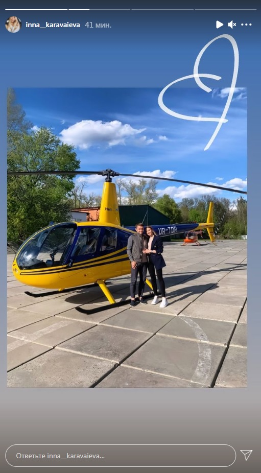 Полузащитник "Динамо" Александр Караваев вместе со своей женой Инной полетал на вертолете над Киевом и его окрестностями, в частности - над резиденцией "Межигорье". Об этом сообщила Инна, выложив в своем Инстаграме фотографии.