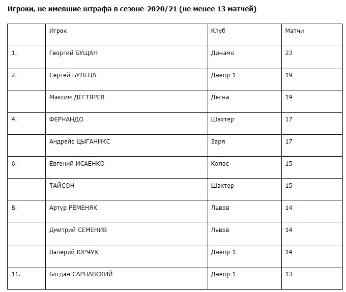 Среди всех футболистов, проведших в сезоне-2020/21 не менее половины матчей, только 11 на протяжении всей турнирной дистанции не заработали даже ни одной желтой карточки. Из этой своего рода команды джентльменов наибольшее количество встреч отыграл голкипер «Динамо» Георгий Бущан, который таким образом и удостоился звания самого дисциплинированного футболиста чемпионата.
