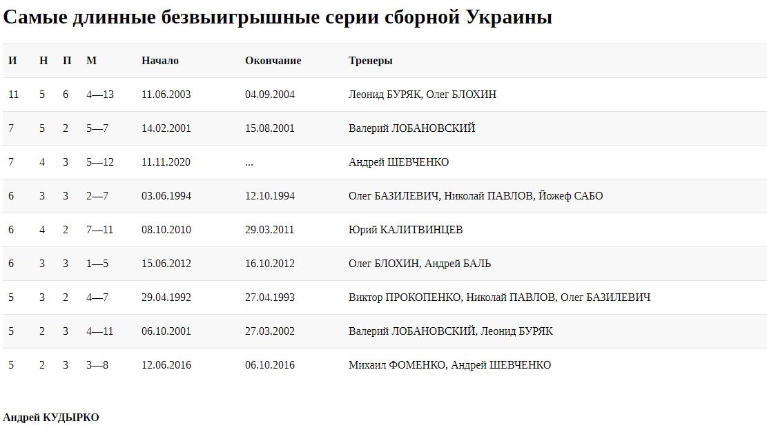 А вот по безвыигрышной серии до рекорда еще далековато. Он был установлен в 2003—2004 годах, когда Леонид Буряк неудачно завершал отбор Евро-2004, а Олег Блохин был занят реконструкцией национальной команды перед стартом отбора ЧМ-2006. Реконструкцией, которая завершилась триумфом в квалификации и дебютным проходом сборной Украины в финальный турнир.