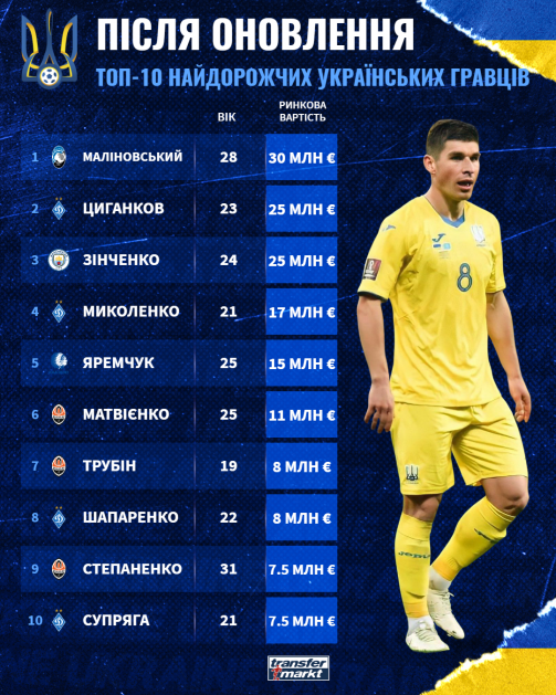 Немецкий портал Transfermarkt обновил трансферную стоимость игроков сборной Украины, которая теперь составляет 216,6 млн евро.
