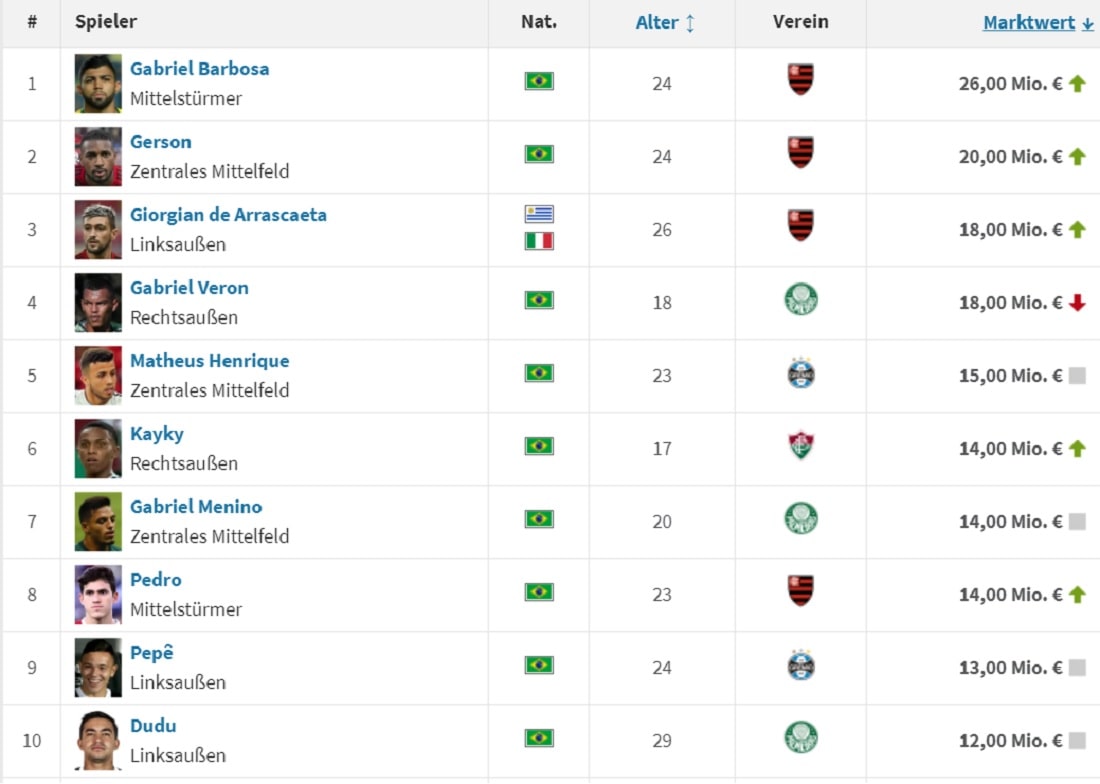 Немецкий портал transfermarkt.de обновил стоимость футболистов, выступающих в элитном дивизионе чемпионата Бразилии, пишет zbirna.com.