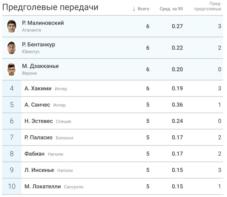 На счету 28-летнего украинца 6 таких пасов – 0,27 в среднем за 90 минут.