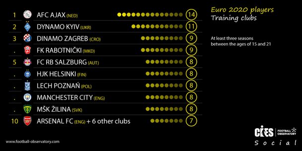 Международный центр спортивных исследований CIES Football Observatory на основе анализа заявок всех национальных сборных на Евро-2020 определил клубы, воспитавшие наибольшее количество игроков для участия в турнире.