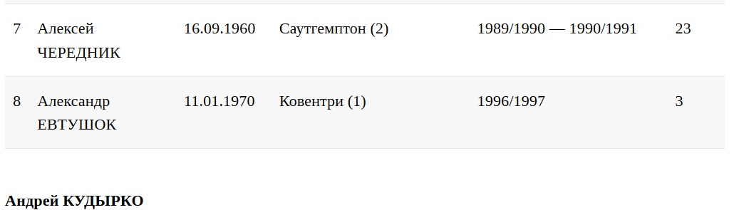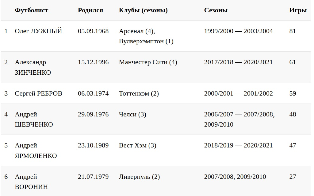 Лидирует же Олег Лужный, который за пять сезонов сыграл 81 матч в АПЛ.