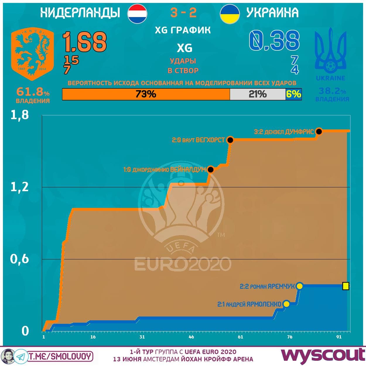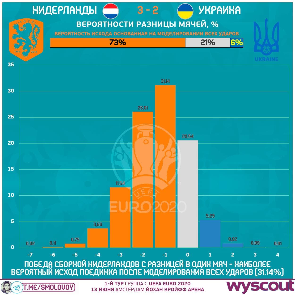 - вероятность победы Нидерландов на основе нанесённых и допущенных ударов составила 73.25%