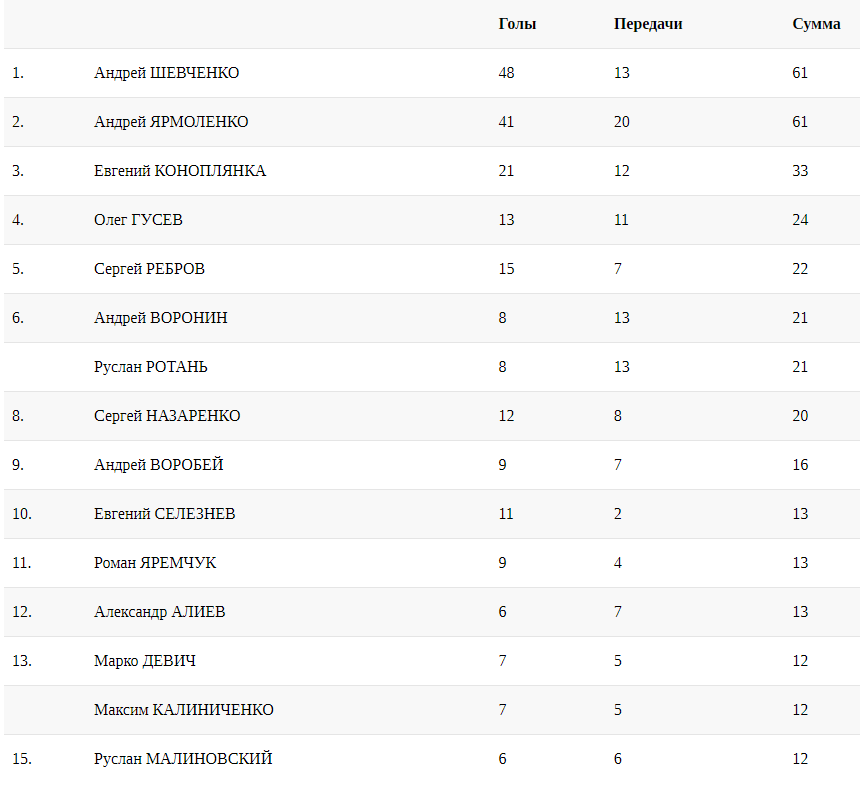 Теперь у них по 61-му очку в этом конкурсе. Но на первом месте по-прежнему главный тренер сборной Украины, поскольку у него больше забитых голов — при равенстве очков принято учитывать именно этот показатель.