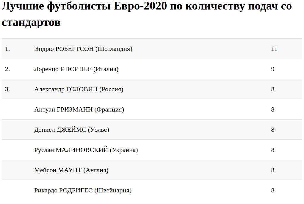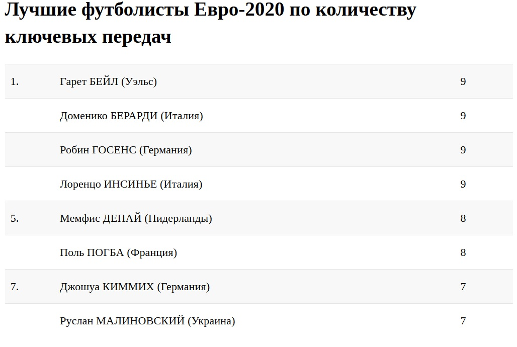 Руслан Малиновский — в Топ-10 лучших игроков Евро-2020 по ключевым передачам