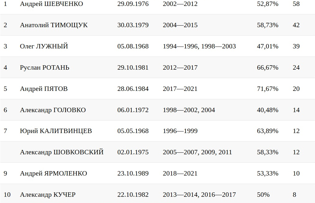 Топ-10 капитанов сборной Украины по количеству матчей