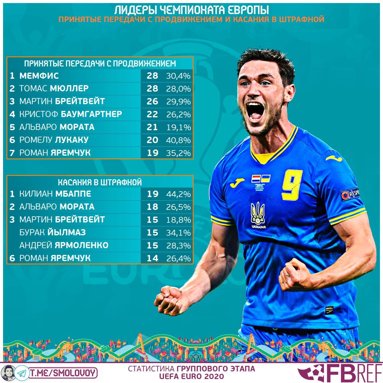У нас 54, и 19 из них успешно выловил Роман Яремчук. Он не лидер, и даже не входит в топ-5 по этому показателю - только седьмой. Но если сравнивать его с лидерами, то выше доля только у...Ромелу Лукаку - принял 40.8% всех передач с продвижением бельгийцев.