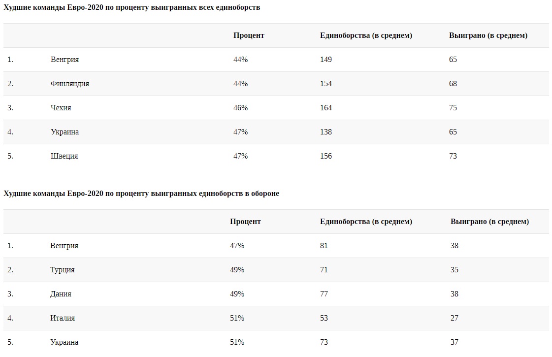 Во всех трех матчах на Евро-2020 футболисты сборной Украины проигрывали своим соперникам в единоборствах. В каждой игре у сине-желтых было по 47% выигранных дуэлей. Это один из худших показателей на турнире (у Швеции — такой же результат). Примерно то же самое можно сказать, если отдельно анализировать борьбу в обороне, пишет zbirna.com.