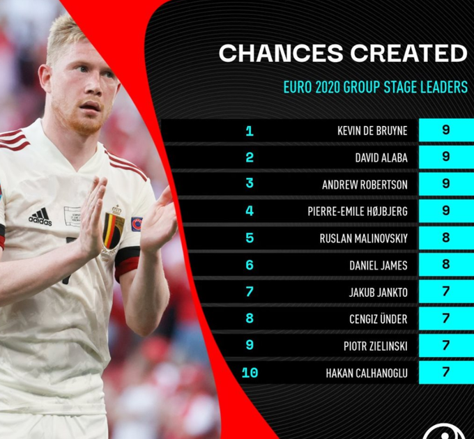 Больше Малиновского моментов создали четыре игрока – бельгиец Кевин де Брейне, австриец Давид Алаба, шотландец Эндрю Робертсон и датчанин Пьер-Эмиль Хейбьерг.