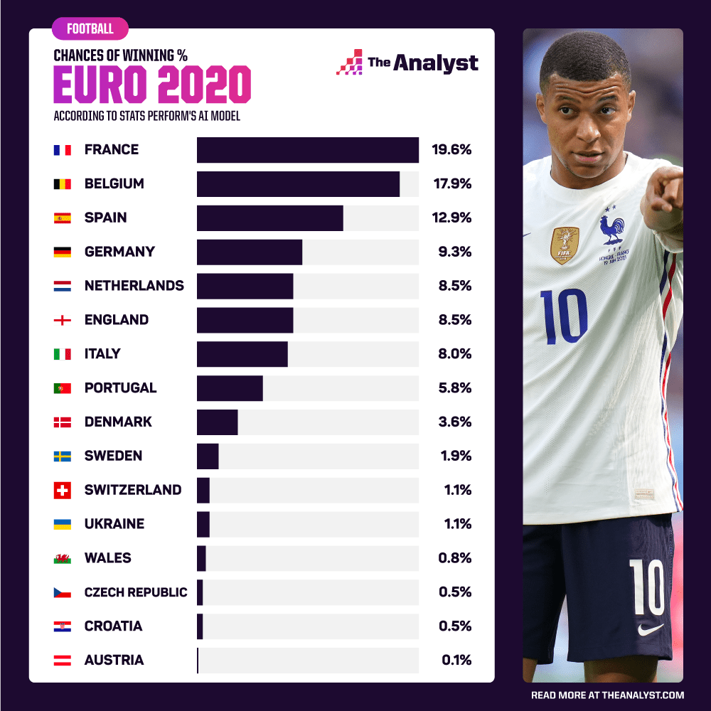 Портал theanalyst.com, используя искусственный интеллект Stats Perform, рассчитал шансы всех участников 1/8 финала Евро-2020 выиграть турнир, пишет zbirna.com.