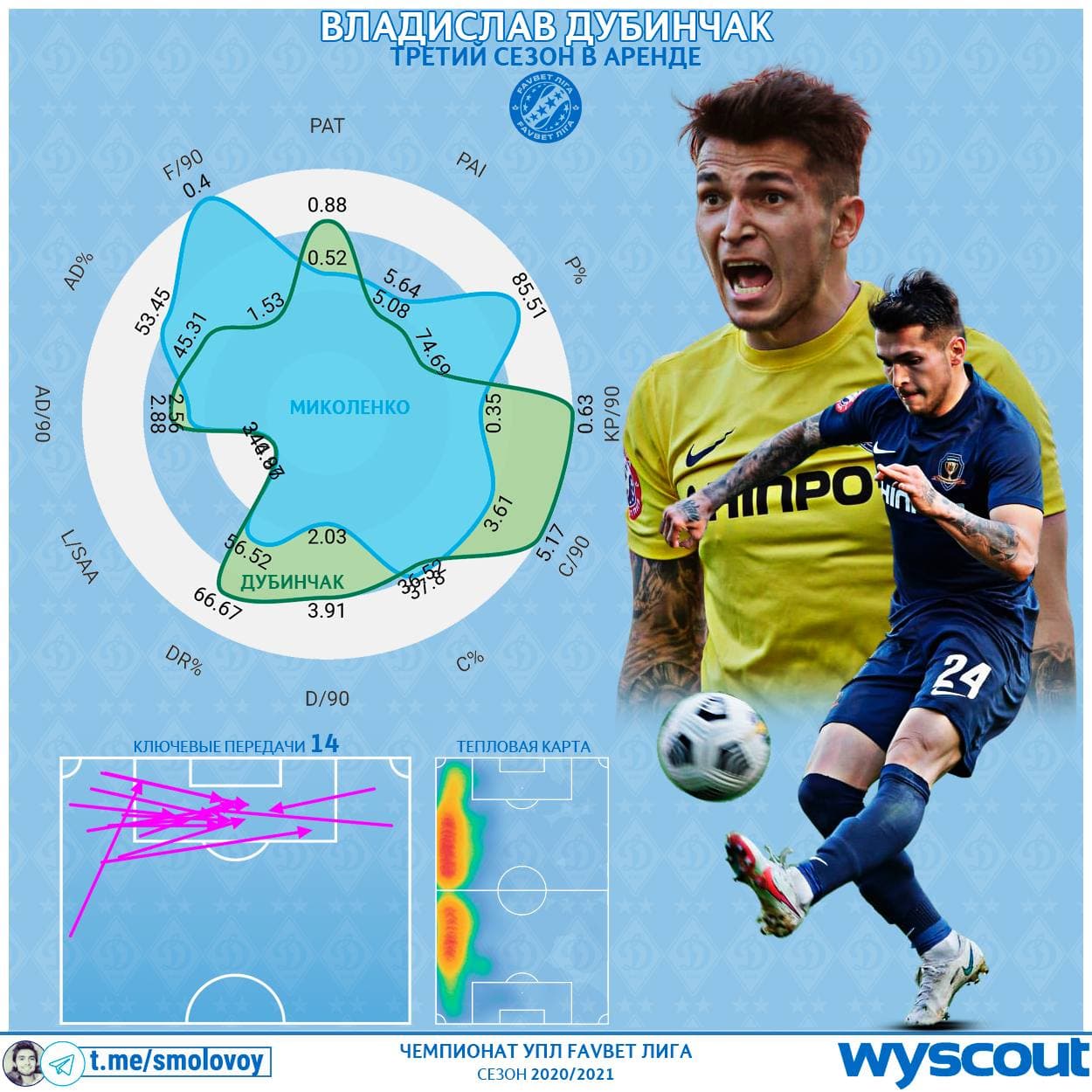 - он получил возможность раскрывать навыки игры в атаке, что плюс для фулбека из колхоза (33 ключевые у Миколенко за три сезона в Динамо в УПЛ, 31 у Дубинчака)