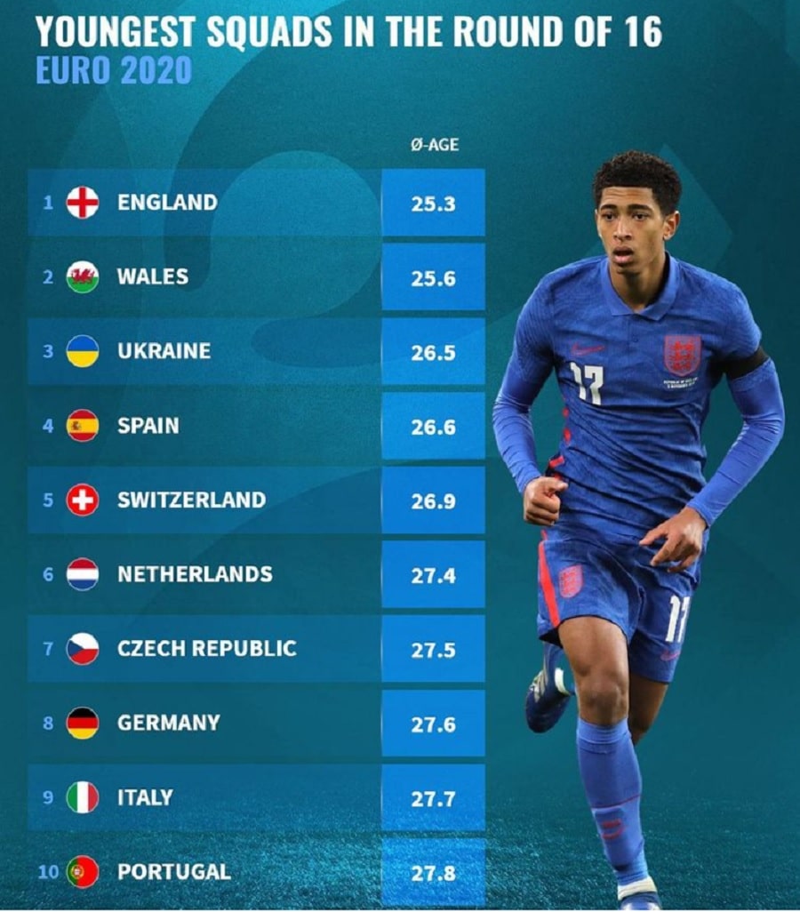 Сборная Украины занимает третье место в рейтинге самых молодых составов участников 1/8 финала Евро-2020, пишет zbirna.com.