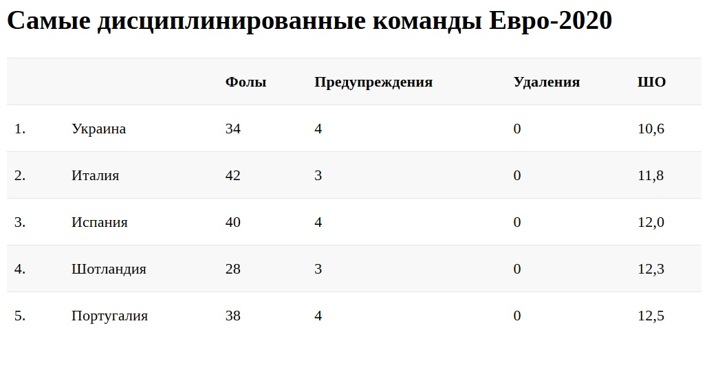 В четырех матчах на Евро-2020 футболисты сборной Украины 34 раз нарушали правила и получили всего четыре желтые карточки (статистика — официального сайта УЕФА). Это лучший показатель на турнире — у Андрея Шевченко самая дисциплинированная команда. Рейтинг мы вычисляли по штрафным очкам в пересчете на 90 минут, так как не все сборные провели на турнире одинаковое время, пишет zbirna.com.