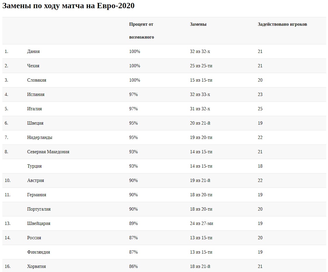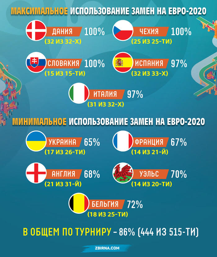 В общей сложности на чемпионате Европы было произведено 444 замены из 515-ти возможных — от 86% от максимально возможного числа рокировок.