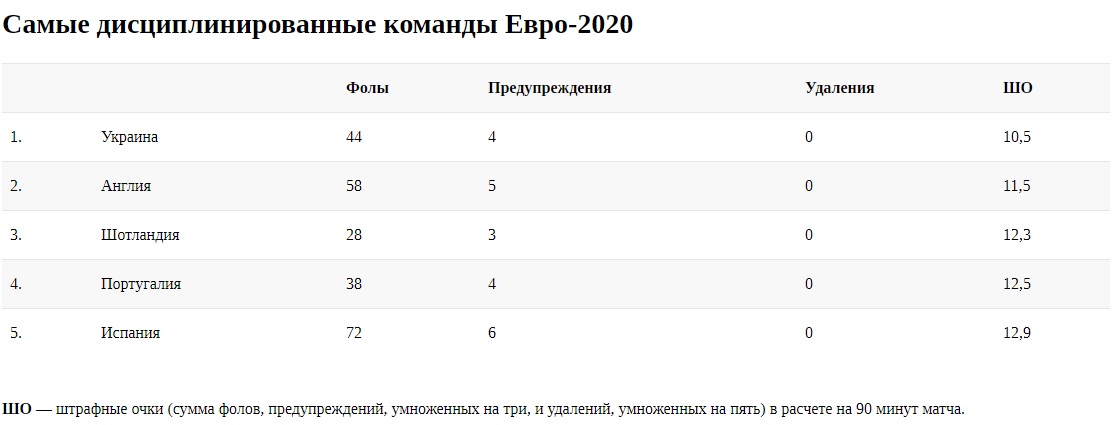 В пяти матчах на Евро-2020 футболисты сборной Украины 44 раза нарушали правила и получили всего четыре желтые карточки (статистика — официального сайта УЕФА), пишет zbirna.com. Это лучший показатель на турнире — у Андрея Шевченко самая дисциплинированная команда. Рейтинг мы вычисляли по штрафным очкам в пересчете на 90 минут, так как не все сборные провели на турнире одинаковое время. После финального матча в теории с первого места нас может потеснить сборная Англии.