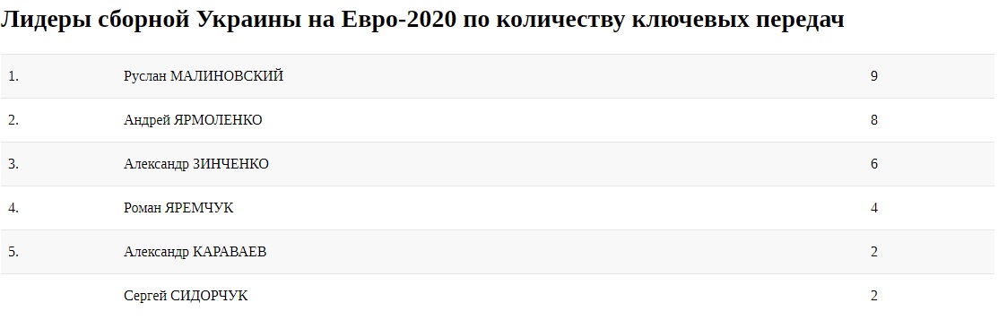 Лидеры по ключевым передачам. Итоги ЕВРО-2020 для сборной Украины