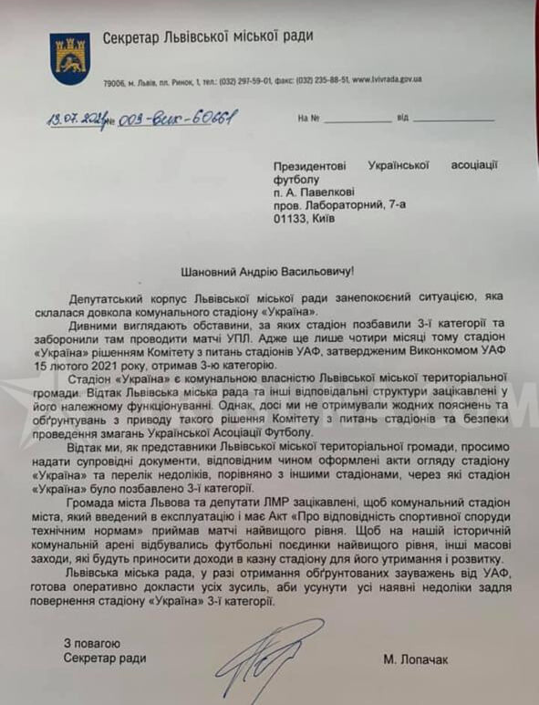 Секретарь Львовского городского совета Маркиян Лопачак направил официальное письмо президенту УАФ Андрею Павелко с просьбой объяснить причины лишения стадиона «Украина» 3-й категории аттестации.