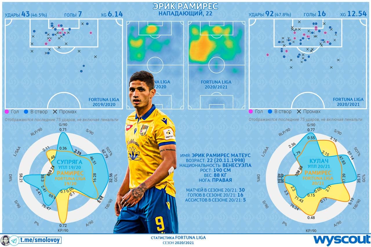 Если прогнать сезон 2020/2021 по Кулачу, то как и в случае с Супрягой (сезоном ранее) уступает в результативности и реализации. Но вновь берёт содействием. Если Кулач обыкновенный «скорер», который впервые в карьере вышел за пределы 30% реализации (35.71%), то Рамирес более подготовлен, что к игре с мячом (60% владения у ДАКа), что без. При идентичной успешности единоборств, Эрик чаще в них вступает (31.17/90 против 20.11/90).