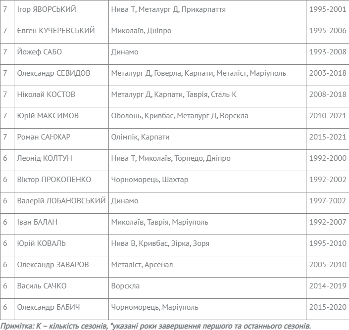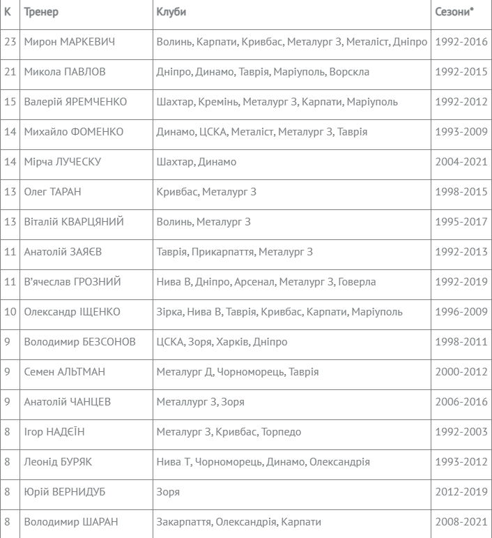 Тренери, які провели найбільшу кількість сезонів у Чемпіонатах України (1992 – 01.07.2021)