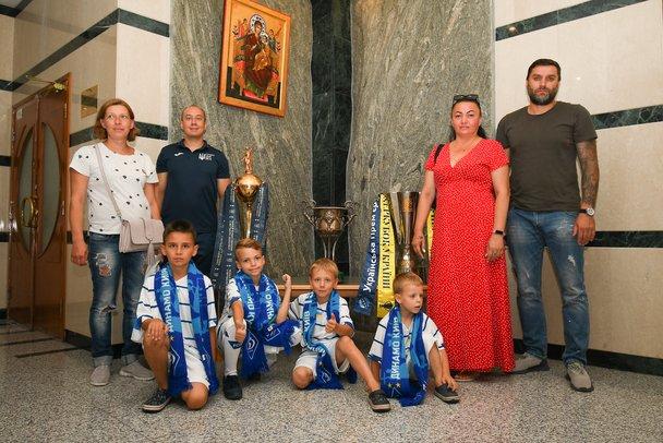 На прощание дети имели возможность сфотографироваться с тремя трофеями, которые «Динамо» завоевало в прошлом сезоне, и получили памятные подарки с символикой «бело-синих» из рук президента Фан-клуба «Динамо» Сергея Михайленко.
