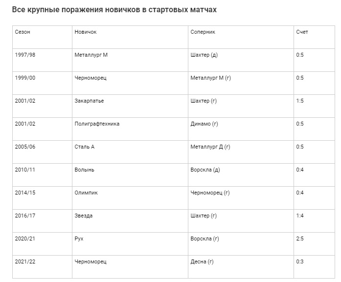 Десятый раз в истории украинских чемпионатов команда, пополнившая ряды элитного дивизиона, потерпела крупное поражение в стартовом матче. При этом «Черноморец» стал первым новичком, «залетевшим» дважды: в 1999 году одесситы уступили мариупольскому «Металлургу» - 0:5.