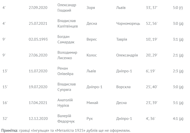 Найшвидкісніші дублі учасників Чемпіонату України-2021/2022 (1992 – 25.07.2021)