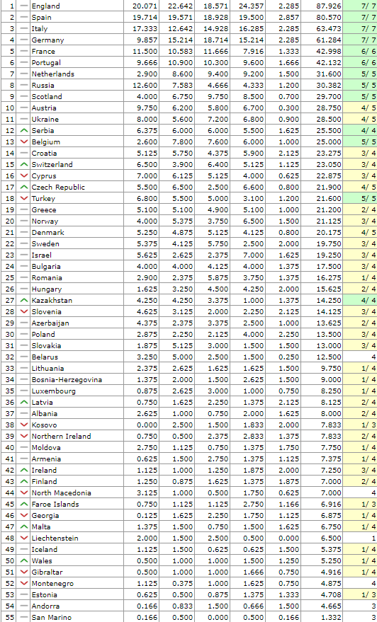 Тим часом, Росія та Шотландія зберегли всі свої команди і навіть трохи відірвалися від України. Додамо, що на 12-ту сходинку піднялася Сербія, яка обійшла Бельгію. Але про загрозу говорити дуже зарано. Хоча у Сербії очки діляться на чотири, тому їм вистачить 12 очок, щоб дістати Україну. Ну, це якщо припустити, що наші команди залишаться без балів.