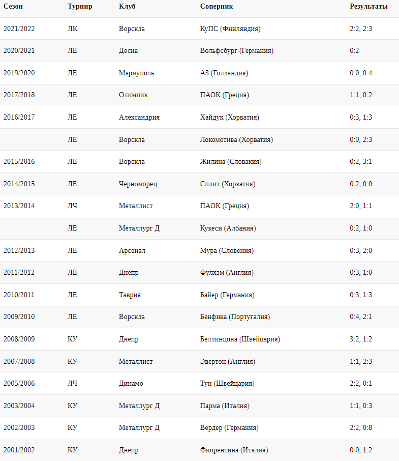 20 последних случаев вылета украинского клуба из еврокубков после первого же этапа