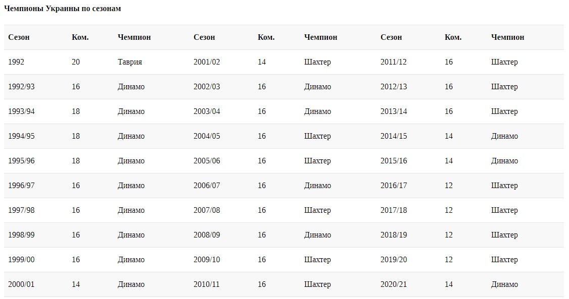 Итак, за 30 предыдущих розыгрышей чемпионата количество участников турнира имело пять значений. В первом сезонп-1992 выступили 20 команд (две группы по 10), а лучшей стала Таврия. После этого началась гегемония двух клубов — Динамо (16 титулов) и Шахтера (13).