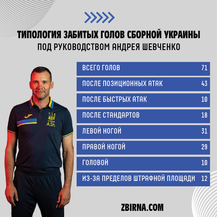 За пять лет работы со сборной Украины Андрей Шевченко добился хороших результатов, но самое важное, что его тренерский штаб поменял философию игры нашей команды, пишет zbirna.com. Для этого привлекались новые футболисты — при Шевченко футболку главной команды страны впервые примерили 35 игроков. Сине-желтые пытались действовать в комбинационном ключе. Примерно в двух матчах из трех они превосходили соперников в контроле мяча, а средняя точность передач выросла до 87%. В результате этого 61% всех голов украинцы забивали после позиционных атак, хотя во все времена мы уповали, как правило, только на контригру.