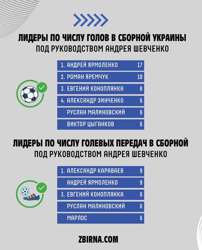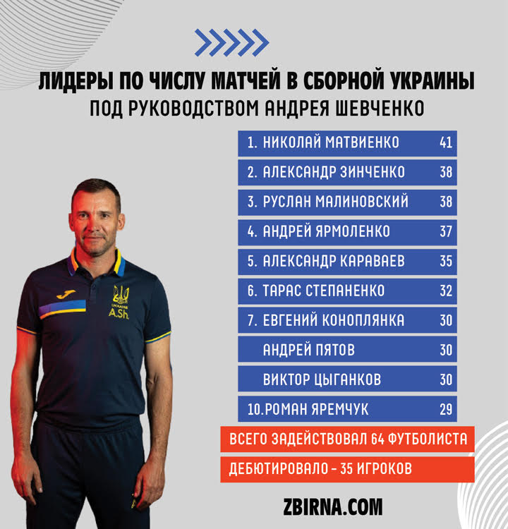Детальный анализ выступления сборной Украины при Андрее Шевченко и тактической работы тренера будет проведен еще не раз. В сравнении с последующими играми команды мы поймем, правильное ли направление было выбрано уже бывшим штабом. Сегодня лишь в общих чертах знакомим вас с основными цифровыми достижениями сборной за это время. Выделяем главных гвардейцев этой эпохи, бомбардиров и ассистентов.