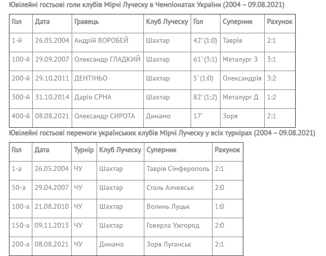 Захисник «Динамо» Олександр Сирота, відкривши рахунок у матчі із «Зорею», стає автором ювілейного, 400-го, виїзного гола гравців українських клубів Мірчі Луческу в Чемпіонатах України.