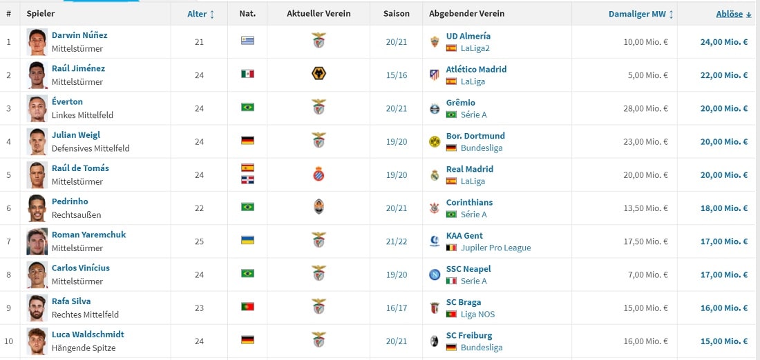 Недавний трансфер нападающего сборной Украины Романа Яремчука из Гента в Бенфику вошел в топ-10 самых дорогих покупок в истории легендарного португальского клуба, пишет zbirna.com.