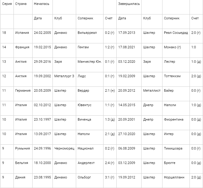 Самые продолжительные серии украинских клубов с пропущенными мячами с командами из одной страны