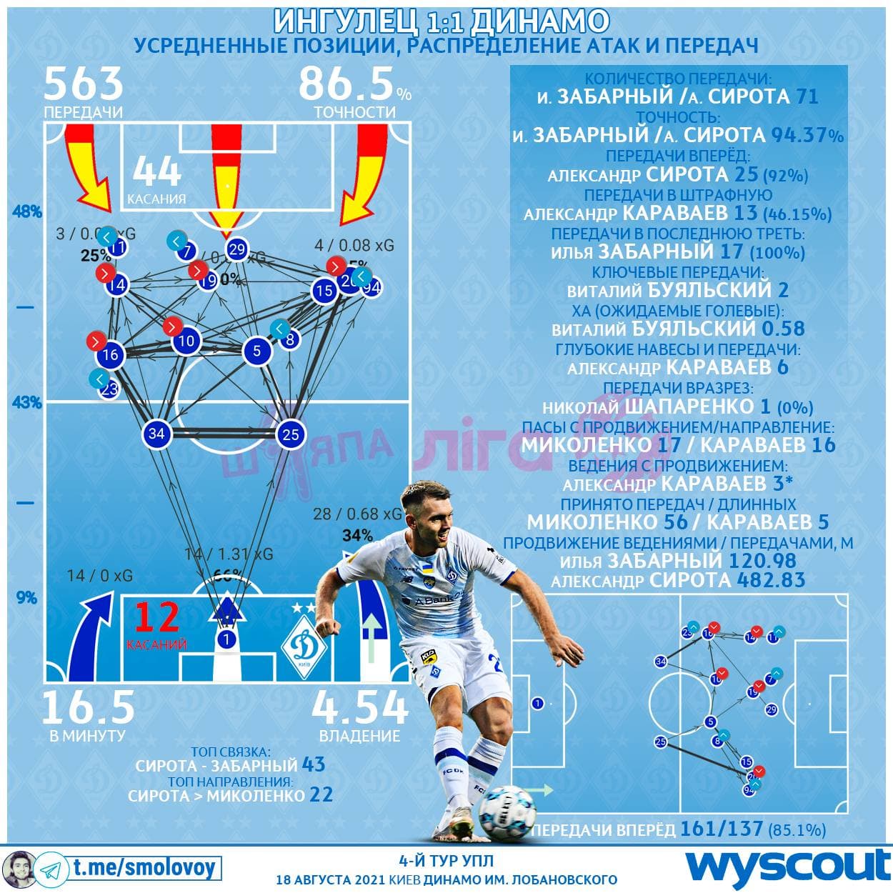 28 из 56 правым флангом. У футболистов Динамо не было желания и мотивации доставать из себя с Ингульцом больше: всё свелось к поиску Караваева в широкой и высокой позиции. 50% всех атак - через правый фланг.