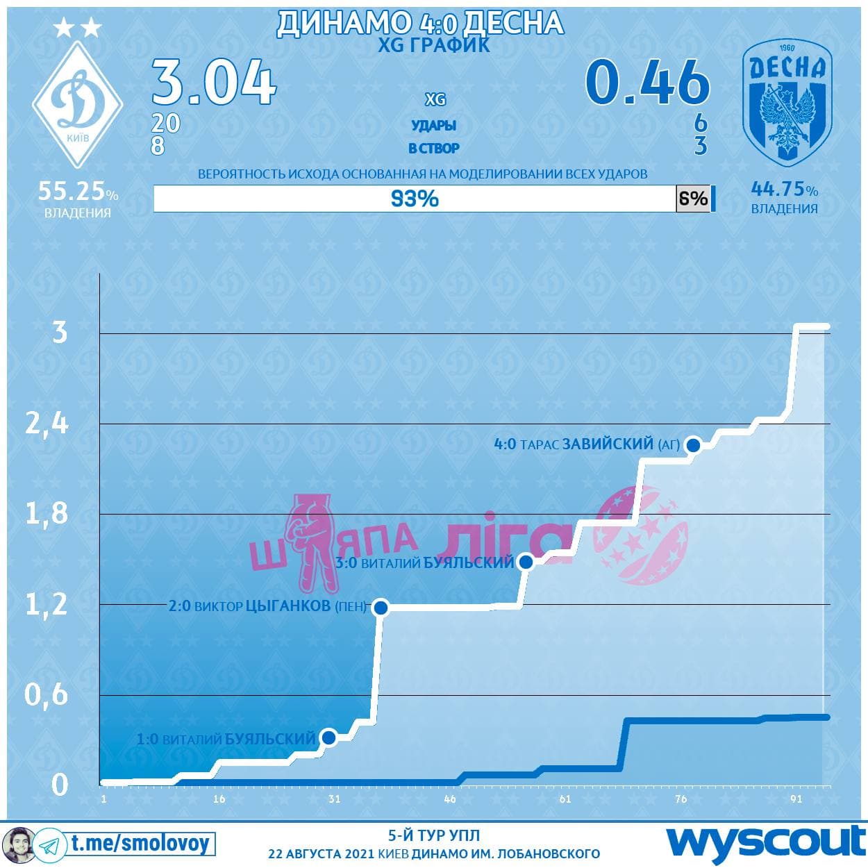 Но всё, что смогла Десна выжать из этого - 0.45 xG на 5 ударах, что даже ниже чем улов Динамо в контригре...