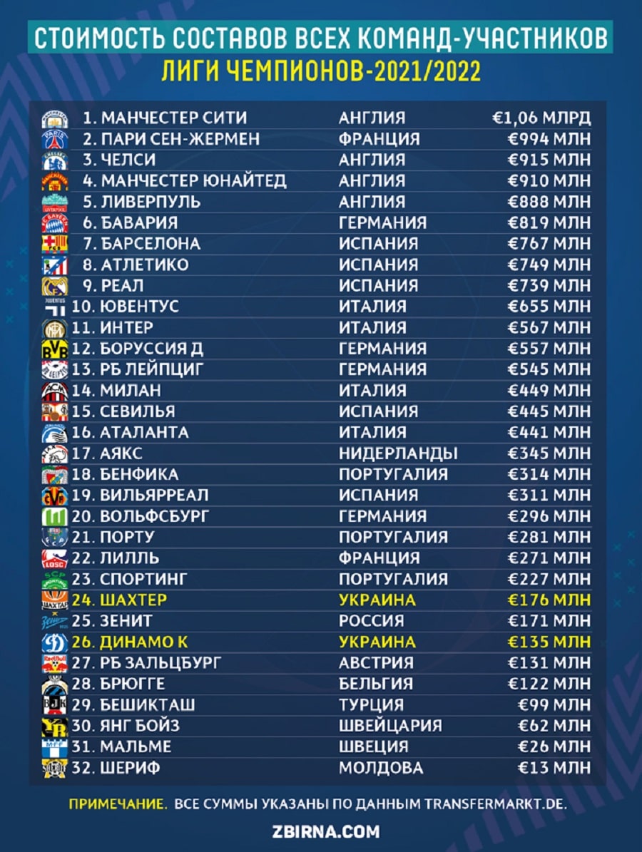 Прямо сейчас по стоимости составов среди всех участников Лиги чемпионов-2021/2022 Шахтер занимает 24-е место, а Динамо — 26-е, пишет zbirna.com.