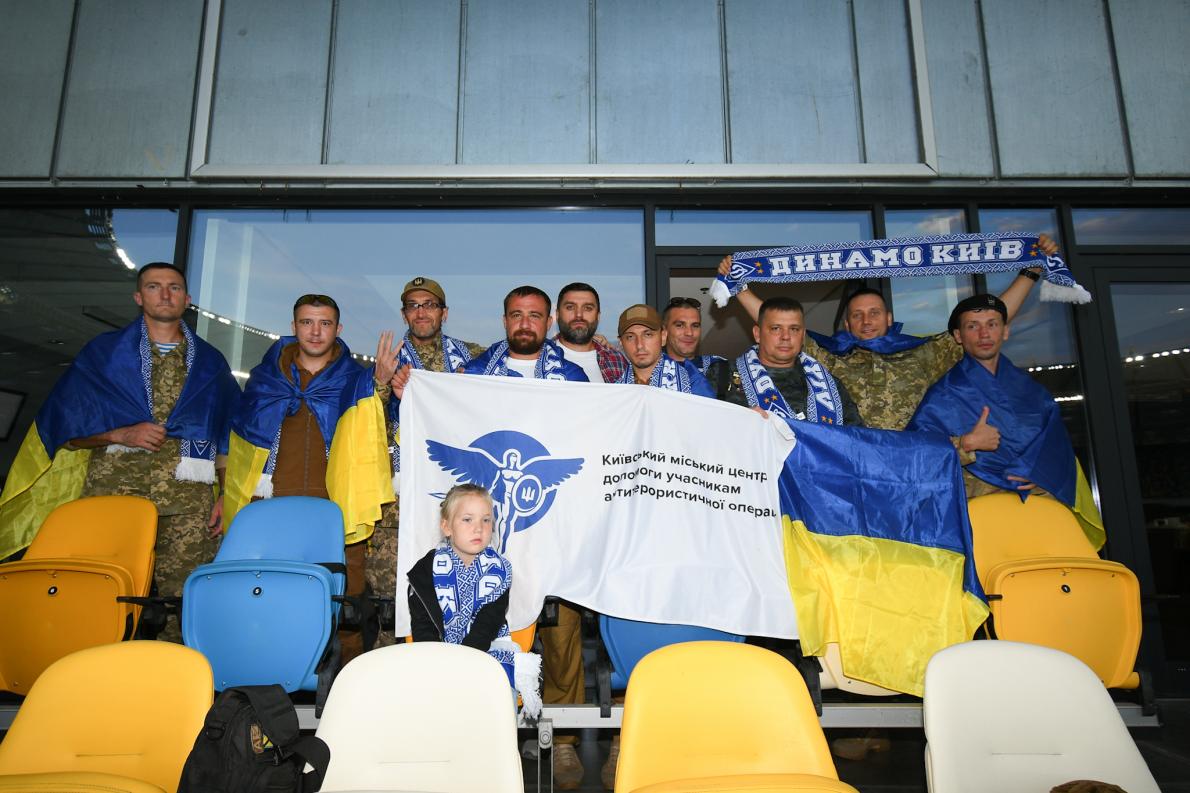 Это бывшие военнослужащие, с которыми взаимодействует Киевский городской центр помощи участникам АТО. На стадионе их радушно встретили представители официального Фан-клуба «Динамо». Все воины были одеты, как положено, по форме, но в VIP-ложе их уже экипировали футбольной динамовской атрибутикой.