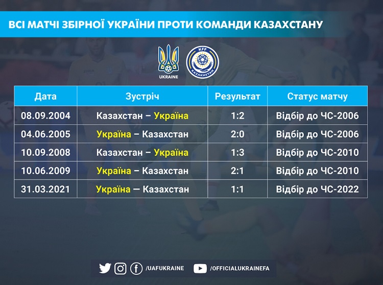 Сьогоднішній матч відбору ЧС-2022 Казахстан - Україна, який розпочнеться о 17.00 за київським часом у Нур-Султані на стадіоні «Астана-Арена», стане для суперників шостою зустріччю в історії.