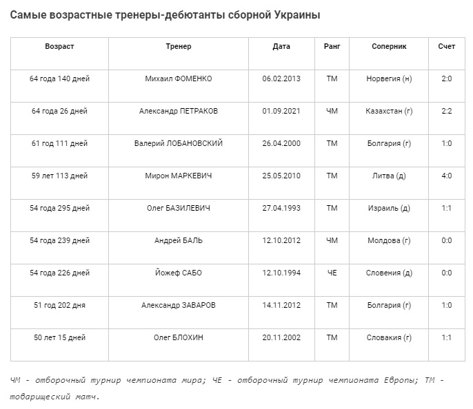 В матче с Казахстаном (2:2) состоялась премьера 16-го по счету главного тренера сборной Украины Александра Петракова. При этом он стал самым возрастным наставником-дебютантом нашей национальной команды после Михаила Фоменко – 64 года 26 дней. К слову, ранее премьера выпадала на официальный матч у четырех тренеров украинцев. Анатолий Коньков в дебюте потерпел фиаско, а Йожеф Сабо, Андрей Баль и Андрей Шевченко, как и Фоменко, довольствовались ничьей.