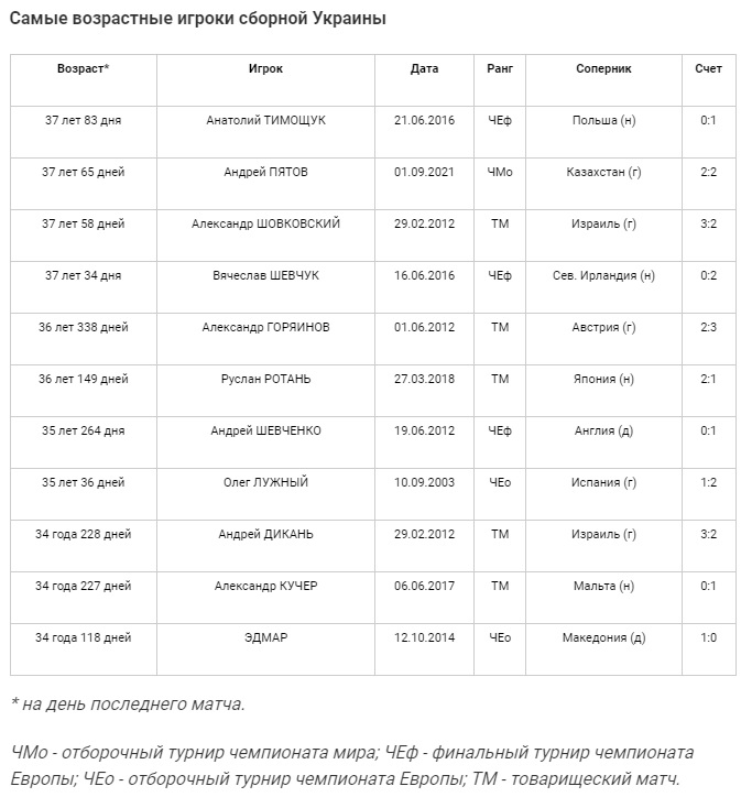 На матч с Казахстаном (2:2) Андрей Пятов вышел в 37 лет 65 дней. Тем самым он возглавил список самых старших вратарей сборной Украины, обойдя Александра Шовковского. В более «преклонном» возрасте за нашу национальную команду выступал только Анатолий Тимощук - 37 лет 83 дня.