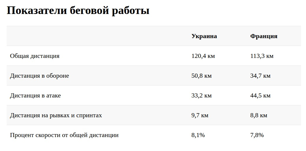 Компания InStat предоставила отчет по беговой работе в матче Украина — Франция, пишет zbirna.com. Наши футболисты превзошли соперника в общей дистанции на 7,1 километра. При этом на рывках и спринтах (на скорости свыше 5,5 метров в секунду) мы тоже оказались лучше. Другое дело, что преимущество сине-желтых достигнуто за счет бега в обороне, но с французами, по всей видимости, играть иначе пока не получается.
