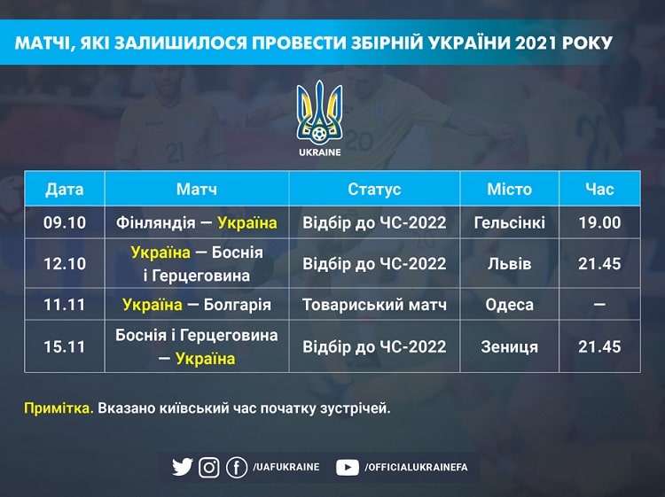 Три з них стануть для команди Олександра Петракова вирішальними у відборі ЧС-2022 - проти Фінляндії в Гельсінкі та Боснії та Герцеговини у Львові й Зениці. Товариський же матч проти Болгарії синьо-жовті проведуть в Одесі.