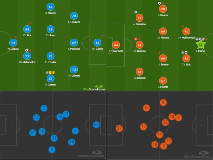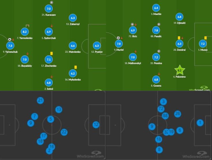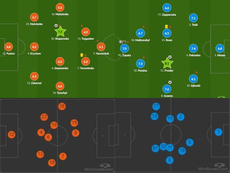Смотрите ниже: слева номинальная расстановка и усредненные позиции игроков сборной Украины против Казахстана, справа – то же самое по «Аталанте» в недавнем матче серии А против «Торино».