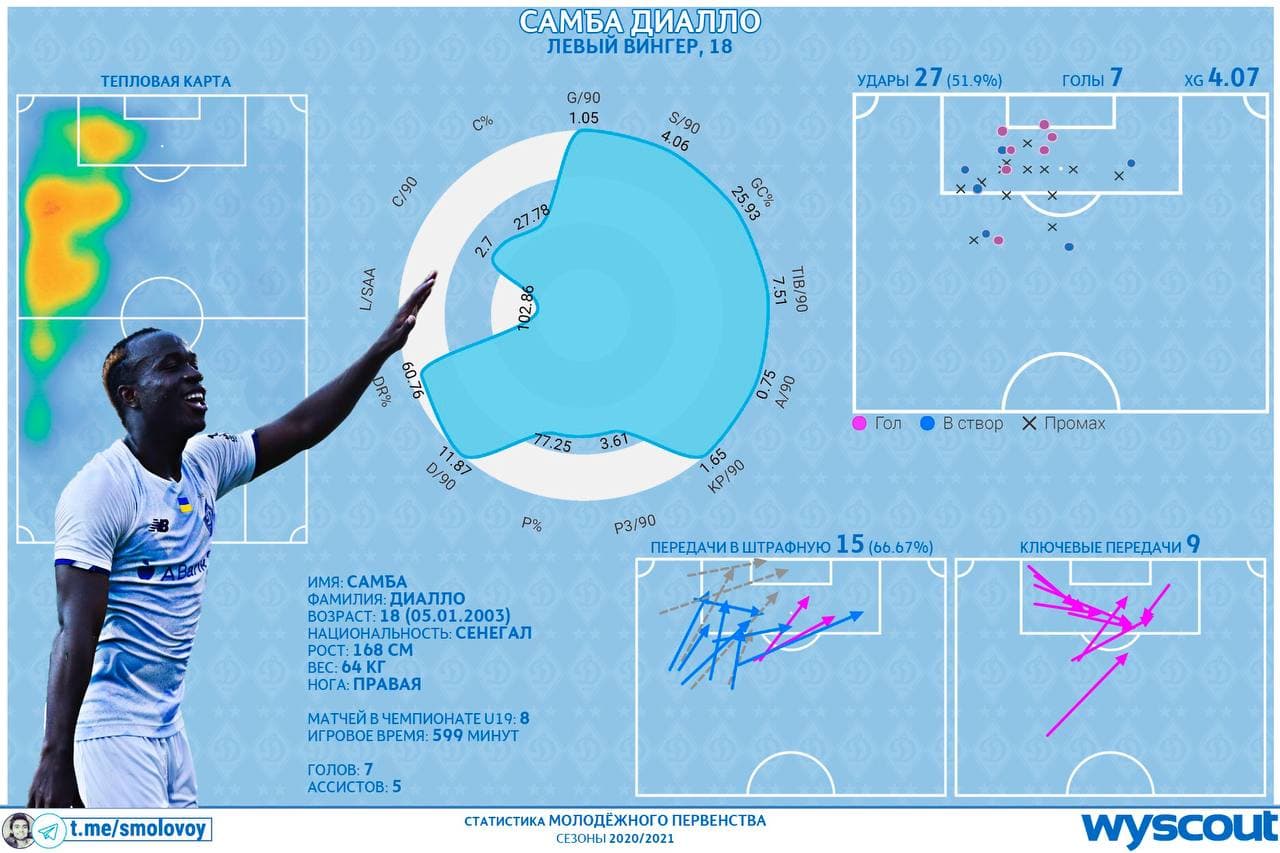 Блогер Михайло Смоловий в своєму телеграм-каналі аналізує гру динамівця Самба Діалло.
